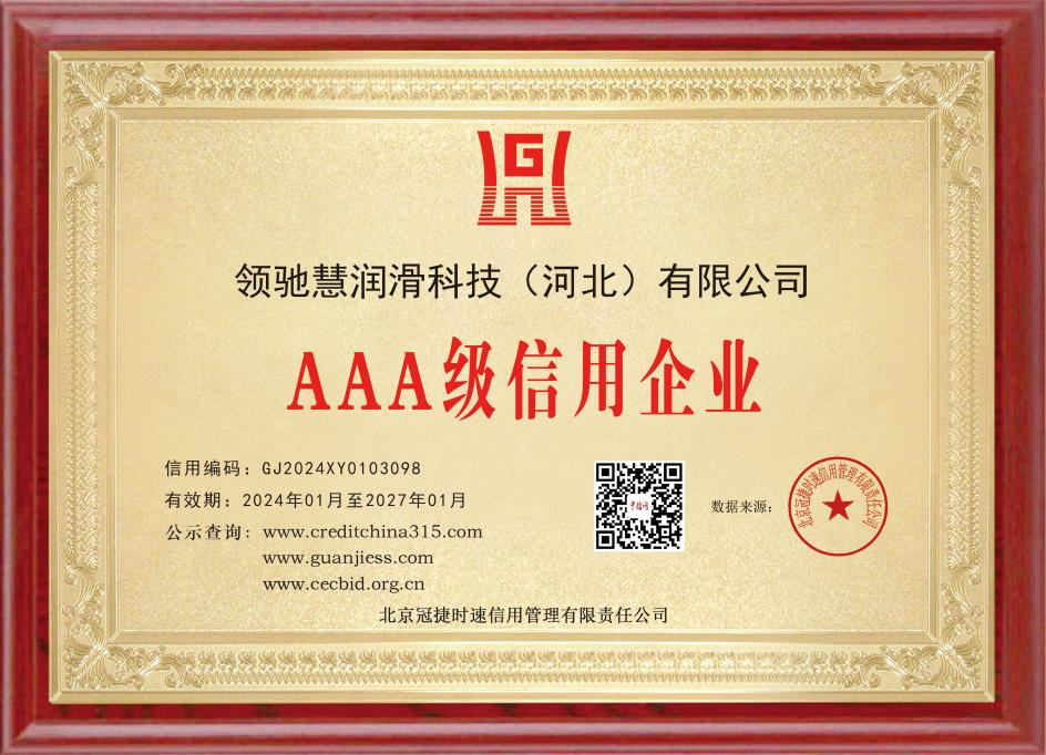 近日,領(lǐng)馳慧潤(rùn)滑科技(河北)有限公司迎來一個(gè)好消息,公司獲得了AAA信用企業(yè)認(rèn)證的榮譽(yù),此信用等級(jí)評(píng)定遵循客觀公正、科學(xué)規(guī)范的原則,對(duì)企業(yè)進(jìn)行綜合評(píng)定。